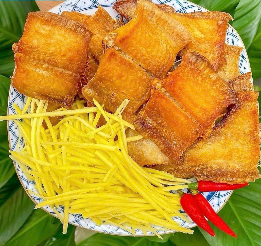 Chiên vàng giòn: Ăn kèm xoài xanh, rau sống và nước mắm chua ngọt.